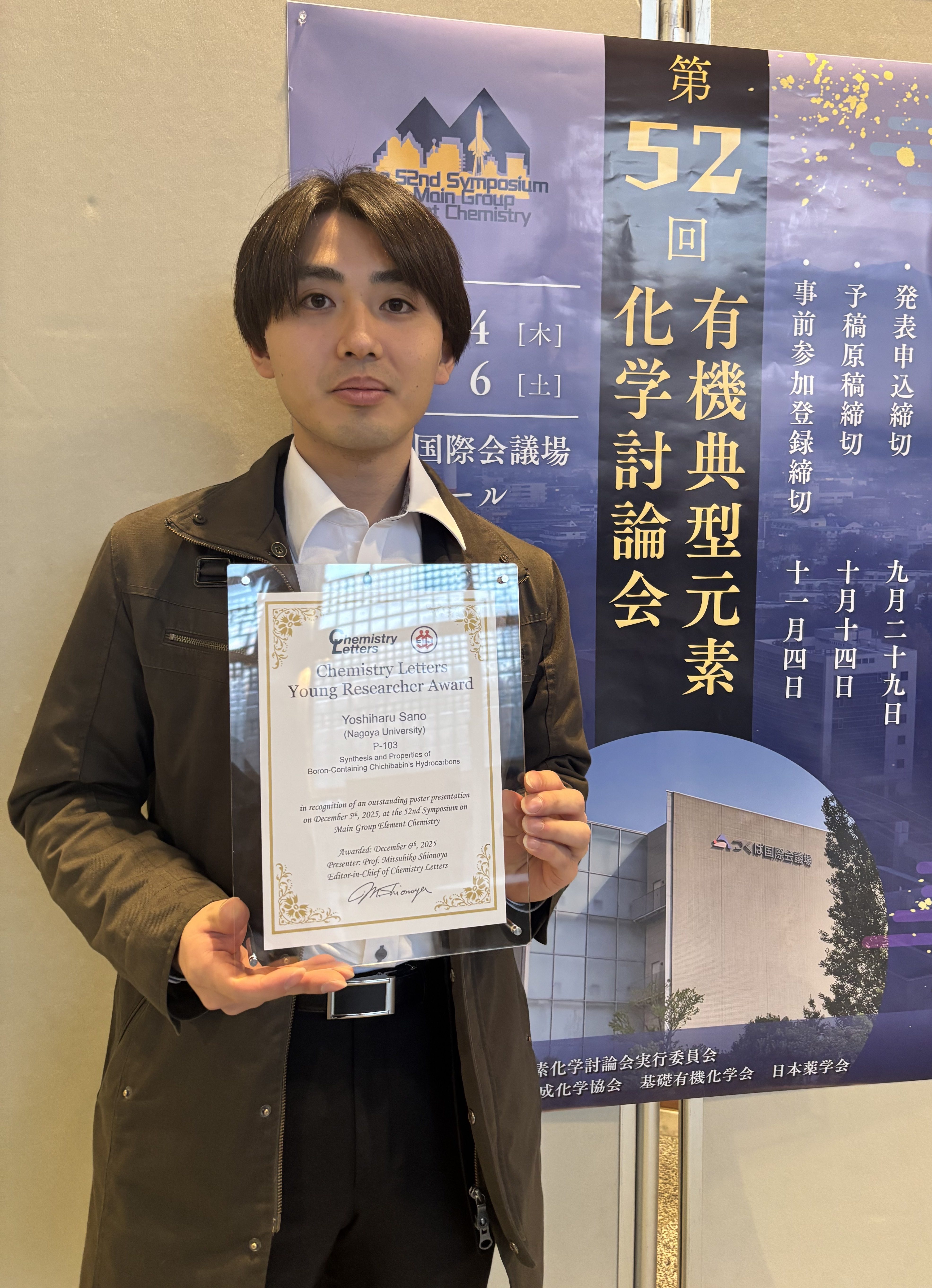受賞(学生) 佐野嘉治さん (M2) が第52回 有機典型元素化学討論会にて優秀ポスター賞を受賞 2025.12.06 2025年12月4日~6日につくばで開催された第52回 有機典型元素化学討論会において,機能有機化学研究室の佐野嘉治さん(M2)が優秀ポスター賞を受賞しました.おめでとうございます!