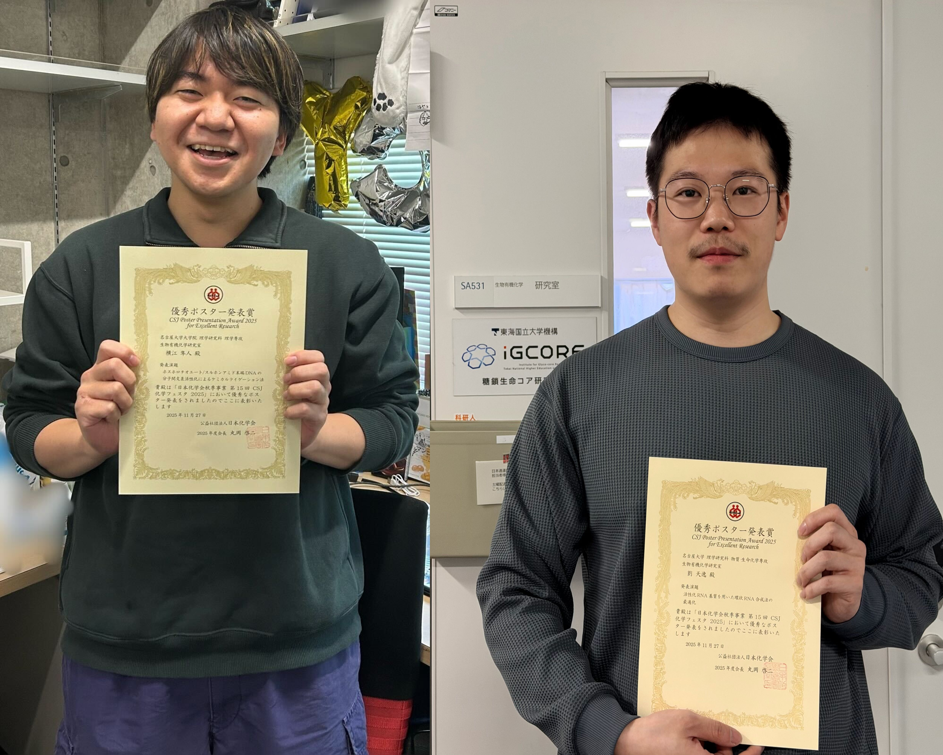 2025年10月22日~24日に船堀で開催された第15回 CSJフェスタにおいて,生物有機化学研究室の劉天逸さん(D2)と横江隼人さん(D1)が優秀ポスター発表賞を受賞しました.おめでとうございます!